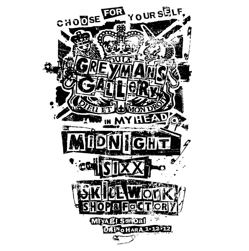 一緒にイベントを行ったmidnight、sixx、そして会場となった私の勤め先でもあるSKILLWORKの名前を使わせて貰ったイベントのスタッフTシャツ的なデザインです。