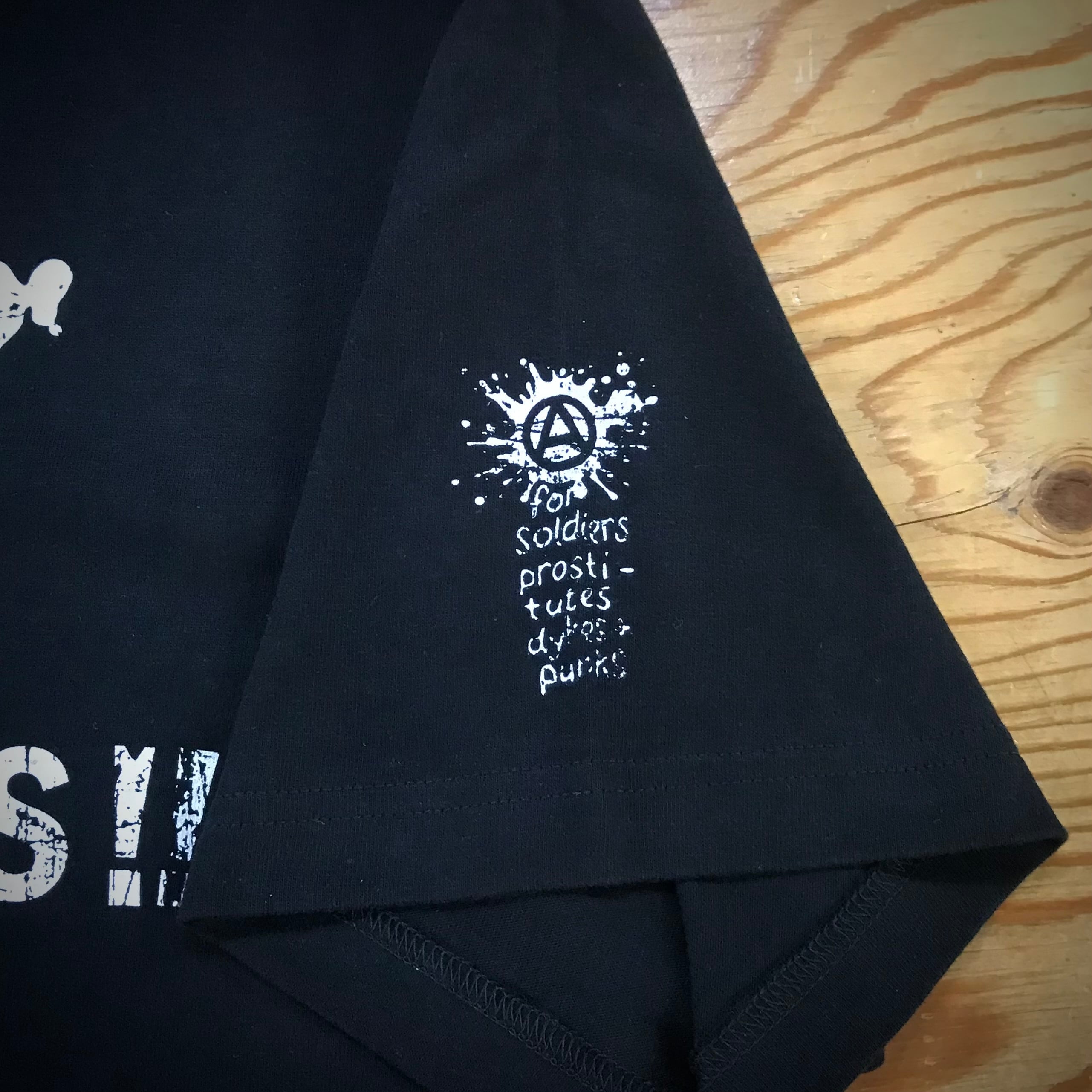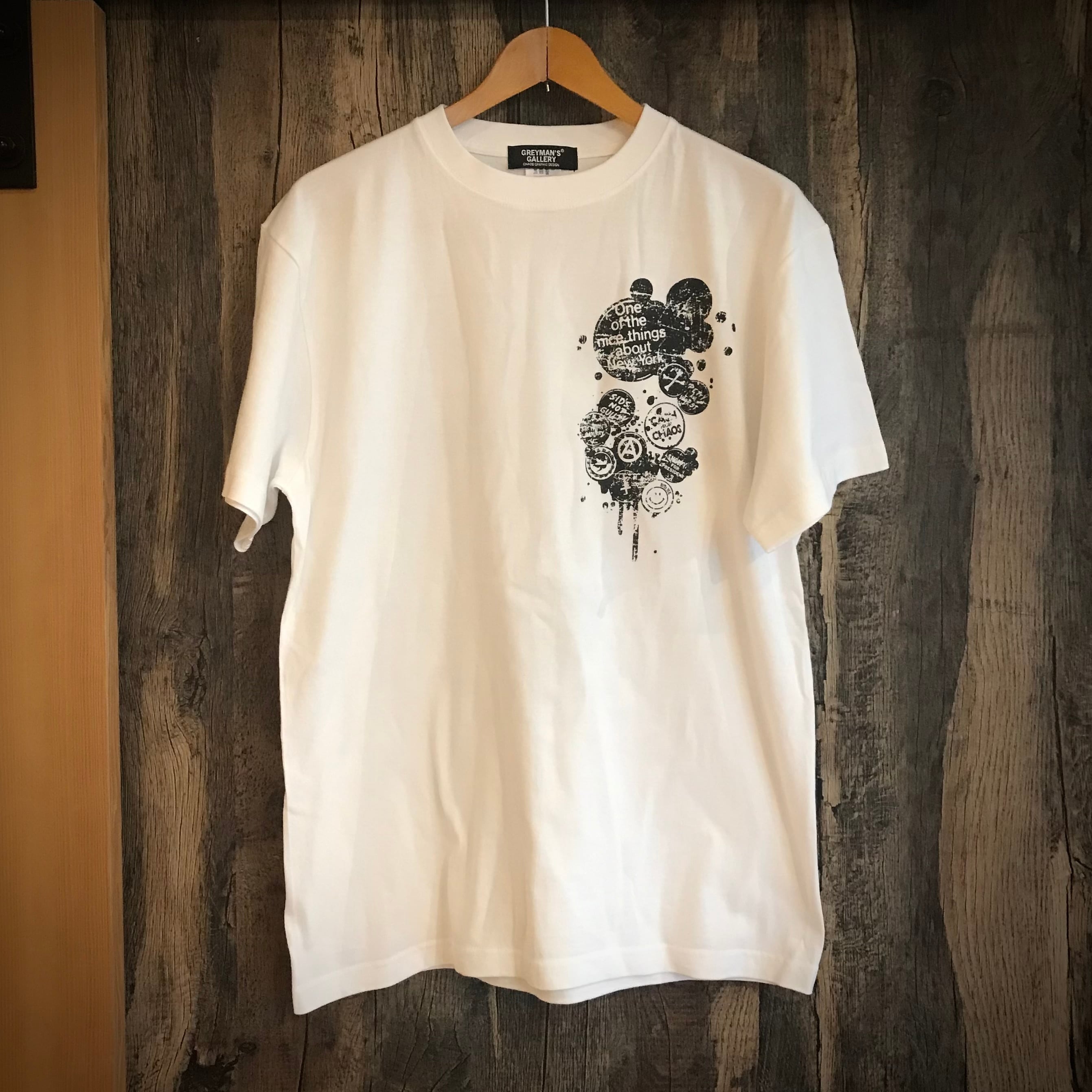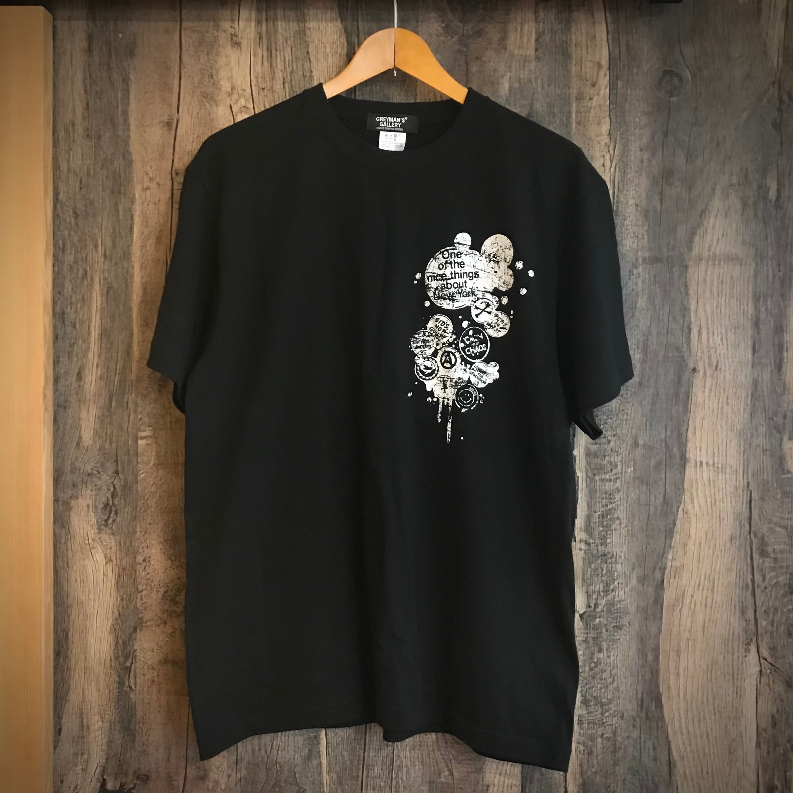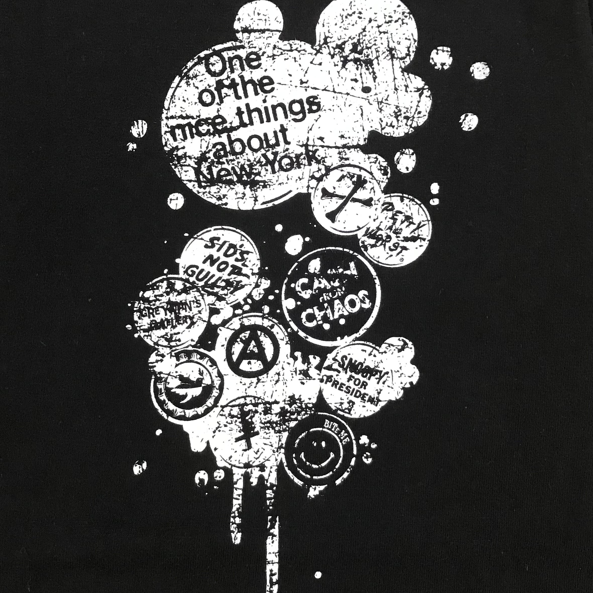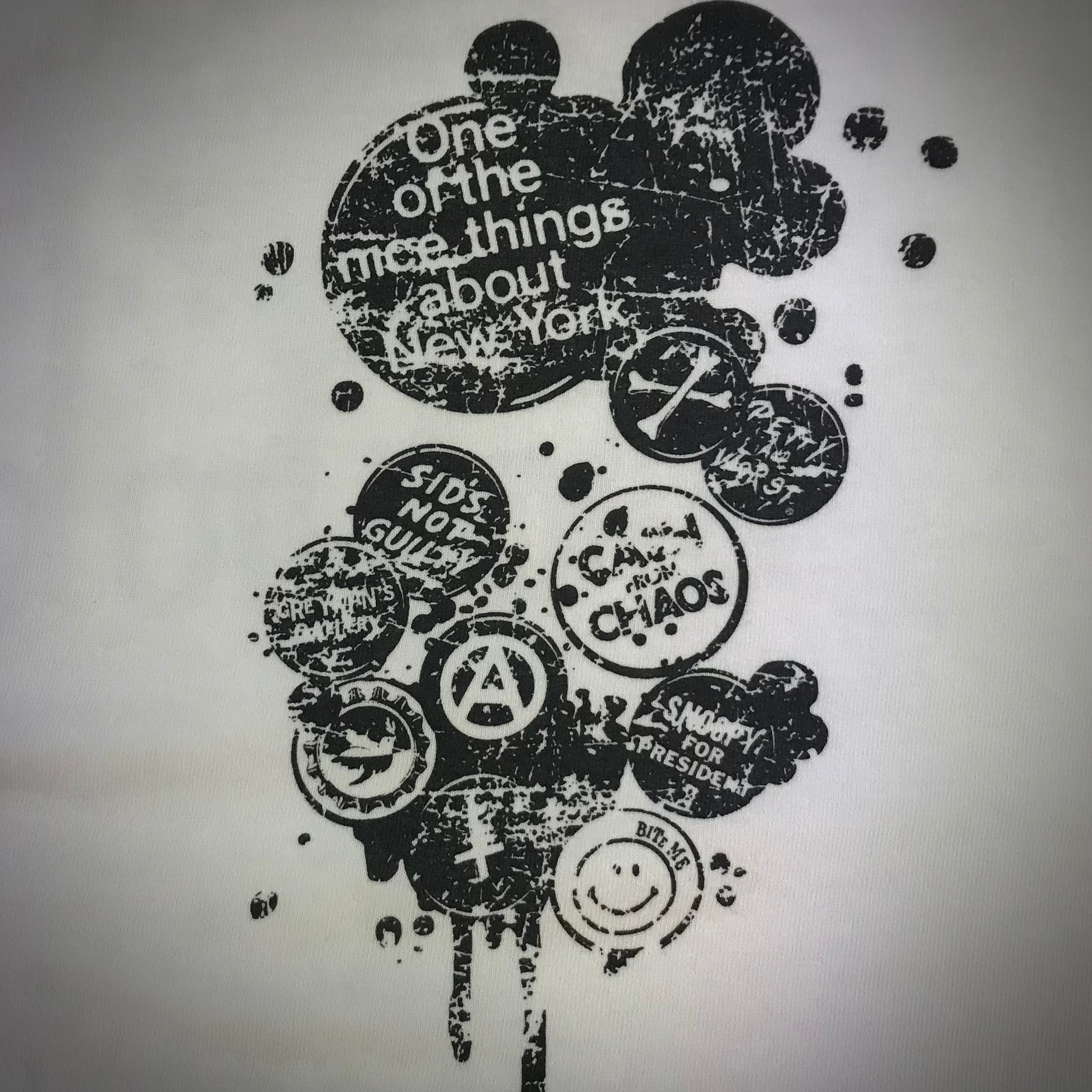 バッジは70年代のパンクを意識したデザインになっており、ライダースジャケットに付けた缶バッジをそのままTシャツに付けた様なデザイン。
